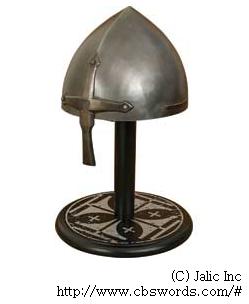中世ヨーロッパの兜で最もポピュラーなもののひとつがこのノルマン・ヘルムです。ノルマン人の進出と共にヨーロッパ各地で使われるようになります。訳語としては、その形状から水滴型兜と呼ばれます。