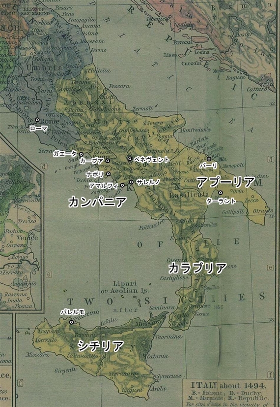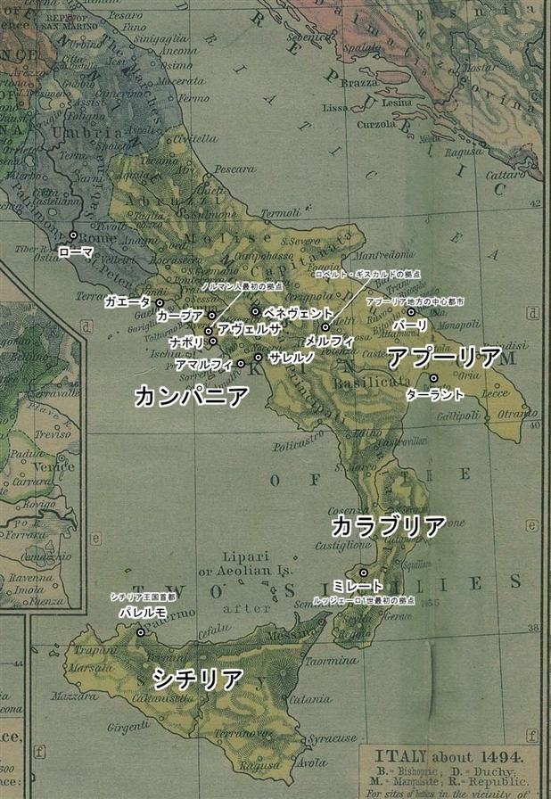 ローマ帝国滅亡後の5世紀末、東ゴート族がイタリア半島を支配した後、東の帝国はユスティニアヌス帝のもと国土の再征服(6世紀初期)に乗り出しました。しかし、イタリアを回復したのも束の間、今度はランゴバルド族の侵攻に遭い、東帝国は長靴型の半島のわずか爪先と踵の部分、すなわちアプーリア地方とカラブリア地方にのみ影響力を持ち、半島中部カンパニア地方に点在するナポリ、アマルフィ、ガエータの都市とそれらに付随する若干の周辺領域に対しては名目上の宗主権を持つのみになってしまいました。その他の南イタリアは、568年にランゴバルド王国が成立したのと同時期に興ったスポレート、ベネヴェントのランゴバルド系両候国が占めていましたが、その後スポレート候国が王国に吸収され、ベネヴェント候国が分裂した結果、ベネヴェント、カープア、サレルノの町を中心にした三つの候国いずれかの支配下に組み込まれていきます。