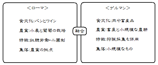 ゲルマン民族の大移動以前から、リーメス(都市の誕生 「ローマ都市」<要塞都市>参照)を通して、ローマ世界とゲルマン世界の融合が見られました。この融合が、中世ヨーロッパの農村の原型となりました。