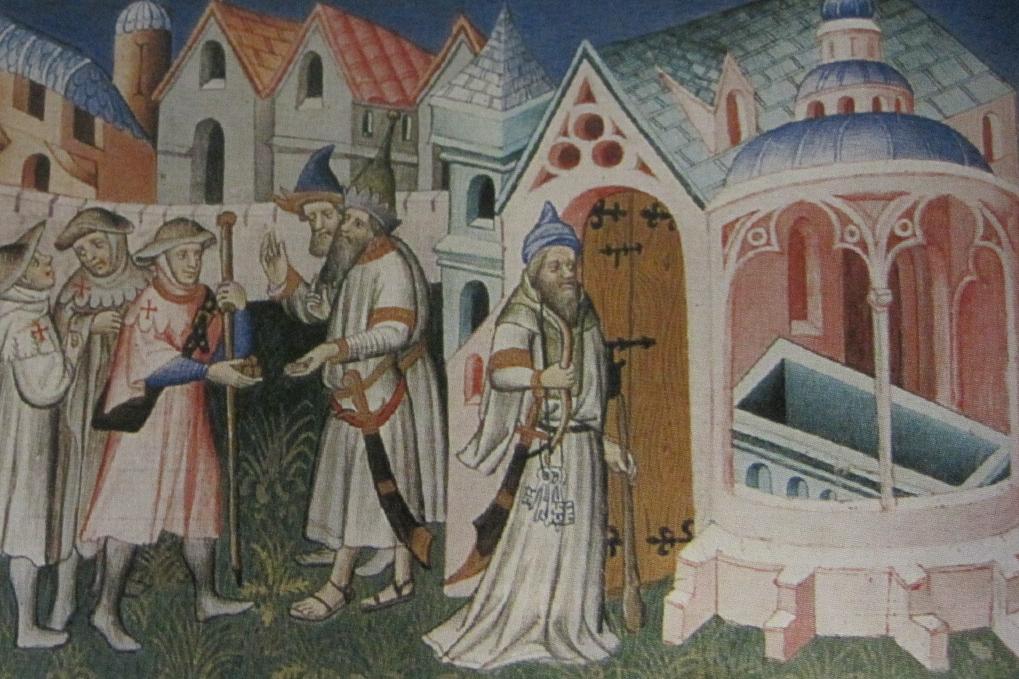 このような状況から、1118年、シャンパーニュ出身の城主ユーグ・ド・パイヤンが友人のジョフロワ・ド・サン=トメールらと共に自発的に巡礼者の保護を始めました。創設期の9人のメンバーによるこの集団は自らを「貧しきキリストの騎士」と呼んでいました。彼らの評判は、領土内での平和維持と軍事力を求めていたボードワン2世の耳にも届きます。王は1119年に、エルサレム市内の土地を騎士団に提供しました。この寄進地は、旧約聖書の時代、ダビデの息子、ソロモンが立てたヤハウェの神殿(テンプル)の跡地であり、イスラムの支配下でアル・アクサ寺院が建てられていました。すでに王宮をダビデ塔に移していたエルサレム王が、この神殿跡地を騎士団に譲ったことにより、「キリストの貧しき騎士」は通称「テンプル騎士団」と呼ばれるようになったのです。
