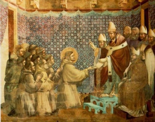 1210年、11名の仲間を連れたフランチェスコはローマに赴き、正式な修道院としての認可を求めました。福音書からとった短い会則と、説教活動の許可をもらうためでした。教皇インノケンティウス3世は初め、みずぼらしい格好の彼らを邪険に扱いましたが、一行が訪ねてきたその晩に、夢の中で倒れ掛かるラテラノ聖堂を支える乞食姿の男を見て、これがフランチェスコであると悟り、彼らに修道院認可の口約を与えたという話が残っています。