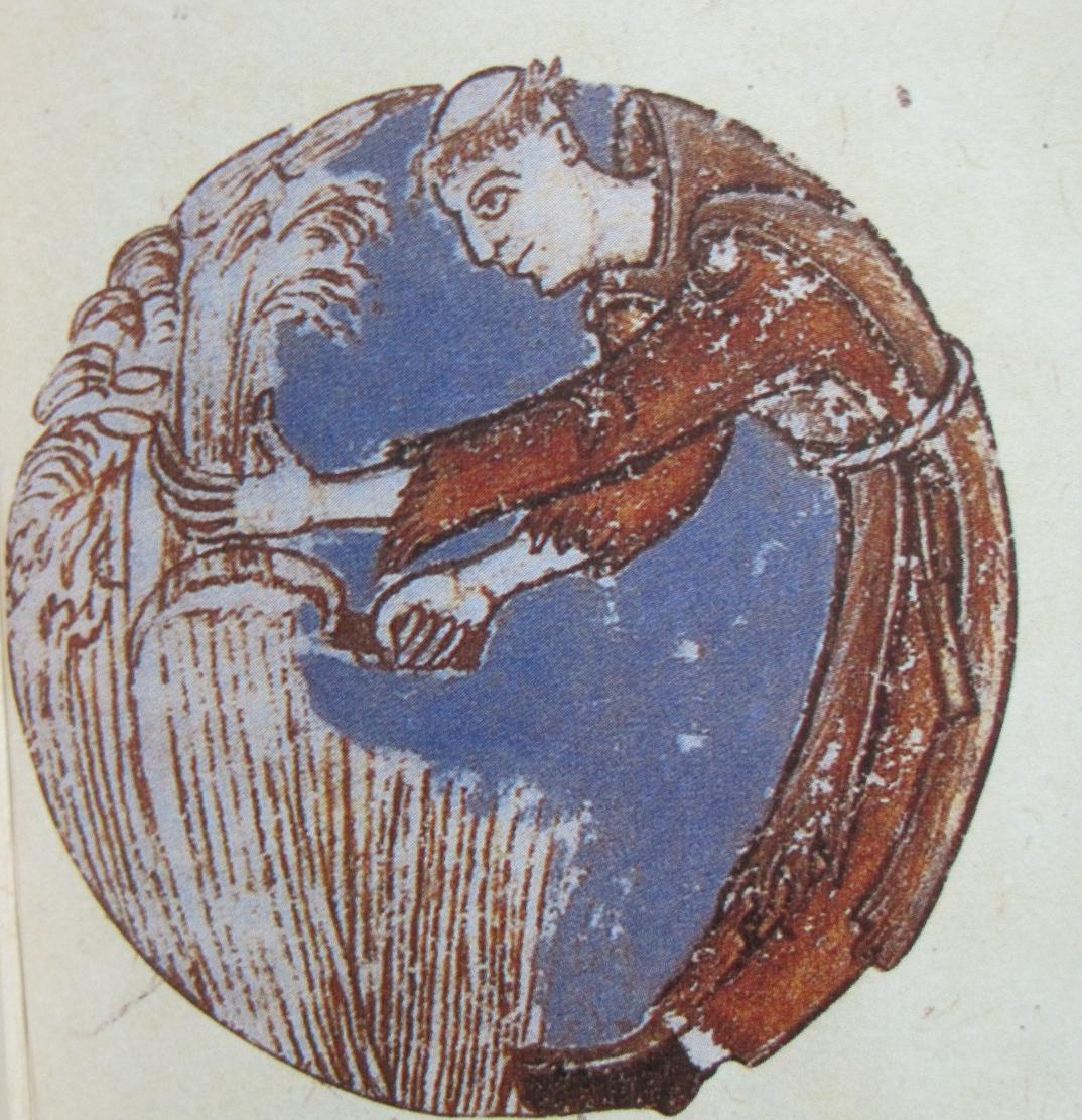 ▲鎌で麦を刈る修道士(シトー会)1109年