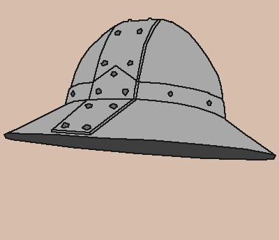 ケトル・ハット(kettle hat)は中世を通じ、最も普及した兜のひとつといえるでしょう。この兜はフランス語ではシャペル・ド・フェール(chapel de fer)、ドイツ語ではアイゼンフット(Eisenhut)と呼ばれますが、どちらの名前も「鉄の帽子」を意味しています(シャペル・ド・フェールの直訳は「鉄の礼拝堂」)。その名の通り、ケトル・ハットは言ってみればただの鉄製の帽子です。つくりの簡素さから、ヨーロッパ全域で使用されたため、種類も豊富で、各地域によって少しずつ形がことなっています。イタリアのものは帽子の天辺が平らにつくられることが多く、スペインでは天辺がとがった水滴型のものが一般的だったようです。また、フランスでは渦巻き模様を施したシャペル・ド・フェールがあり、ドイツのアイゼンフットは天辺が球形で、鍔部分の境界近くにのぞき穴があるものもありました。