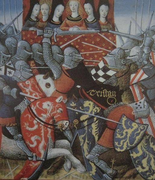 馬上槍試合は、11世紀頃から中世全体を通して盛んに行われていました。試合は大きく団体戦のトゥルネイと、一騎打ちのジョストに分かれていました。我々がイメージする馬上槍試合はジョストということですね。ジョストは当初、大規模なトゥルネイの前座競技でしたが、後の時代にはジョストだけが独立して馬上槍試合を構成することもありました。初期の馬上槍試合は、ほとんど実践と変わらぬ状況で行われる模擬戦争で、武器も実践と同じものがつかわれていました。本当の戦争と違うのは、戦場に中立地点が設定されていることくらいでした。