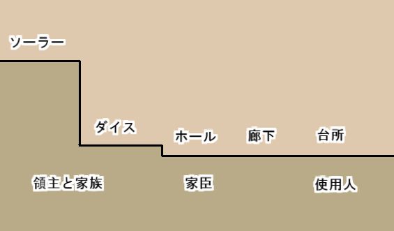 マナーハウスは時代の経過と共に居住性を高めていきました。二部屋構造の次にはホールを挟んでソーラーの反対側に台所や食料庫が置かれるようになり、さらに13世紀にはホールのソーラーよりに一段高いスペース(ダイス)が置かれるようになります。台所が近くなったことで、それまで別棟の台所で造っていた料理を二階まで持っていく手間がはぶけ、熱いままの晩餐を食べることが出来るようになりました。またダイスの形成は、古ゲルマン時代からの戦士集団としての団結精神を養っていた主人と家臣が共にとる食事の形式から、封建制の上下関係を明確に表す形式への変化を促しました。領主は、家族やときには賓客と共にダイスの上で上等な椅子に腰掛けながら食事をしたのです。こうして、マナーハウスは領主一家の居住性を追及していく中で、封建制的身分秩序を一本の軸として持つ建物へと進化していったといえます。