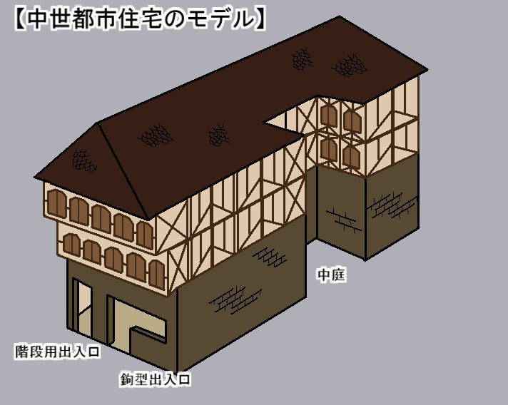 初期の都市住宅は木造が一般的でしたが、都市住民の財力が向上するに従って、石造・煉瓦造りのものへと変化していきます。こうして、柱、梁などの木造骨組をそのまま外部に露出せ、骨組みの間を石や煉瓦で埋めて壁を造るハーフティンバー造りが中世住宅の基本形として定着するようになります。完全に石造にする余裕がない場合は上階を支える地階のみを石造にしました。また、防火のために屋根も藁葺、木製のものからスレート(粘板岩の薄板)葺きのものへと変わっていきます。しかしながら、プライバシーの意識は相変わらず弱いままで、ベッドにカーテンを備えるなどの工夫はなされるものの、農村の住宅と基本的には変わらない居間・寝室の二部屋構造は維持されました。住宅に個室が普及するのは近世以降のことです。
